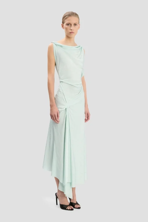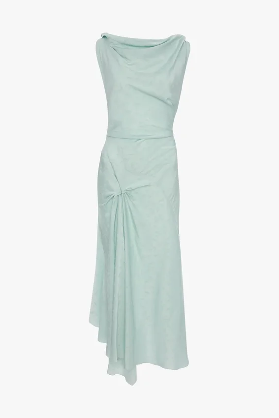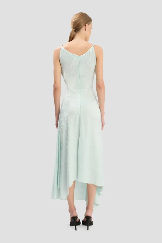 el jacquard texturizado aporta un acabado sofisticado al vestido midi Posy en color aguamarina. Caracterizado por tirantes retorcidos, un dobladillo asimétrico, un distintivo detalle plisado en la cintura y la parte delantera de la falda, y una espalda en forma de V, es una prenda elegante pero provocativa.